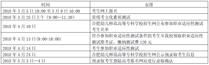 附:合肥幼儿师范高等专科学校2018年分类考试招生时间安排表